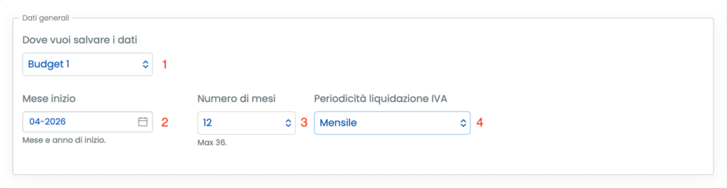 - Mese di inizio (2): definisce il primo mese della previsione finanziaria ed è quindi il punto di partenza dell’orizzonte del Budget Finanziario;