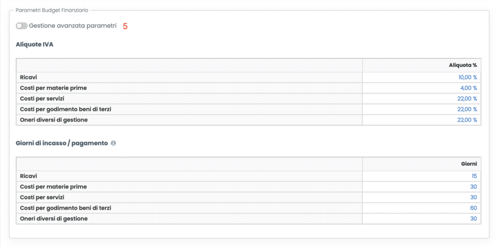 - Aliquote IVA e giorni di incasso/pagamento (5): rispettivamente ai ricavi e alle più importanti voci di costo, è possibile inserire specifiche aliquote IVA e giorni di ritardo nell’incasso o nel pagamento, al fine di rendere la previsione dei flussi finanziari maggiormente accurata. Se ad esempio l’aliquota IVA media associata ai ricavi dell’impresa è pari al 10% e i giorni medi di ritardo per l’incasso sono 15, basta inserire tali valori nelle rispettive caselle: