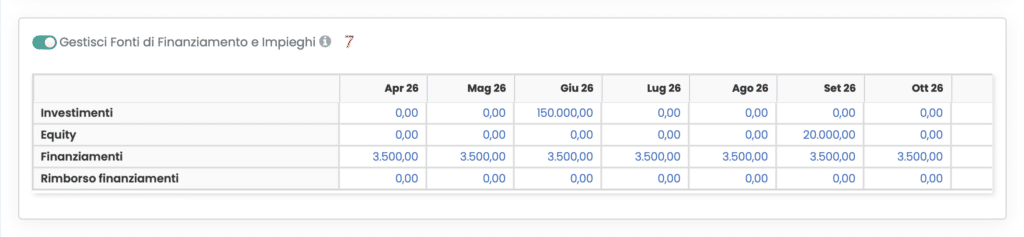 - Gestione delle fonti e degli impieghi (7): cliccando sullo switch Gestisci Fonti di Finanziamento e Impieghi è possibile inserire il valore di eventuali investimenti, aumenti di capitale e finanziamenti per ciascun mese di previsione.