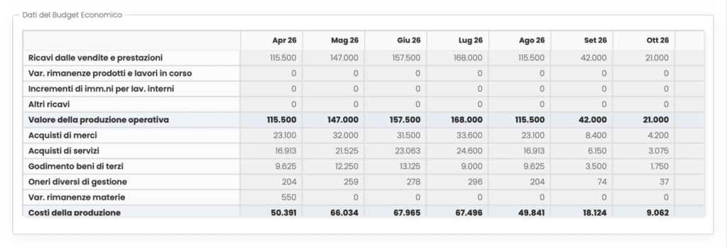 I valori del Budget Economico sono riportati in sola lettura nella sezione Dati del Budget Economico. Per modificare tali valori è necessario accedere dalla barra laterale a Budget Previsionale > Budget Economico e successivamente cliccare sulle celle di cui si desidera modificare il valore.