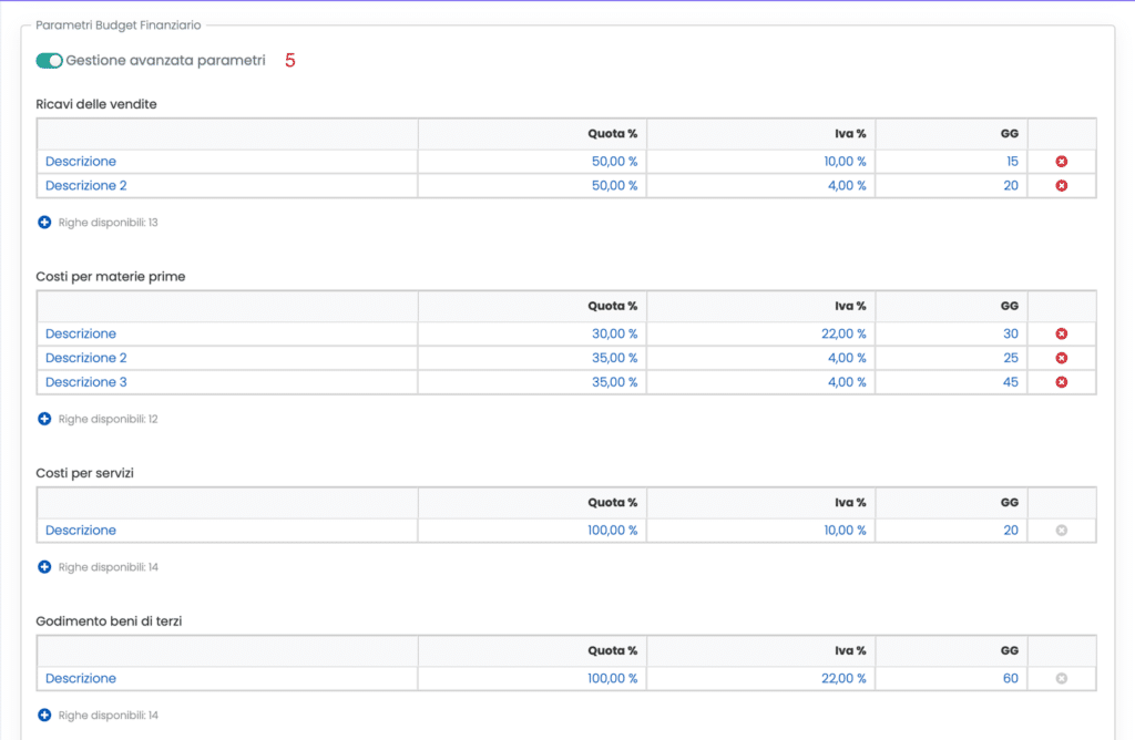 In tale modalità, per ciascuna delle voci sopra indicate, è possibile suddividere l’importo in quote percentuali e associare a ciascuna quota specifiche aliquote IVA e differenti tempi di incasso/pagamento. Ad esempio, è possibile attribuire al 50% dei ricavi un’aliquota IVA del 10% e un tempo di incasso di 15 giorni, e al restante 50% un’aliquota IVA del 4% con un tempo di incasso di 20 giorni: