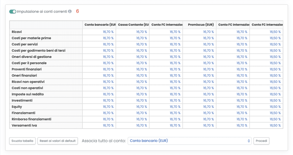 - Imputazione ai conti correnti (6): cliccando sullo switch Imputazione ai conti correnti, si ha la possibilità di definire come ripartire i flussi generati per il Budget Finanziario tra i conti correnti registrati su BPilot. Per impostazione predefinita, le scadenze vengono suddivise in modo equo tra i diversi conti correnti, ma è possibile modificare manualmente la ripartizione per ciascuna voce economico/finanziaria.