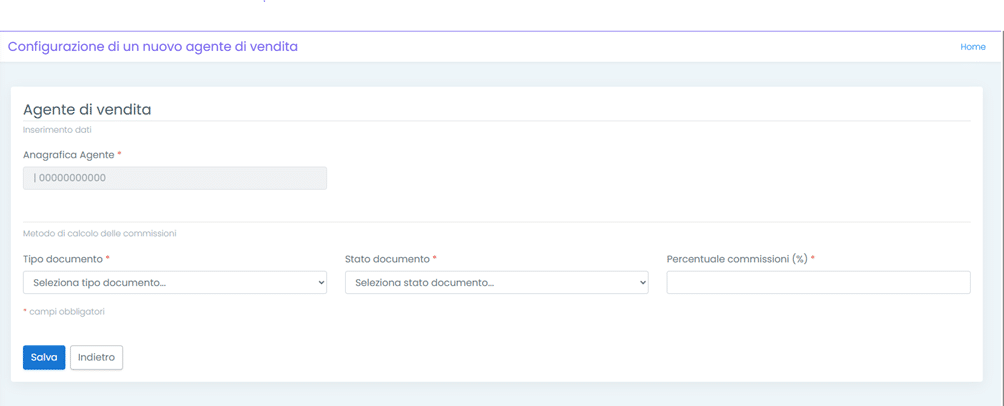 Si aprirà una schermata nella quale sarà necessario inserire i dati relativi al tipo di documento, allo stato del documento e alla percentuale di commissione associata all’agente.