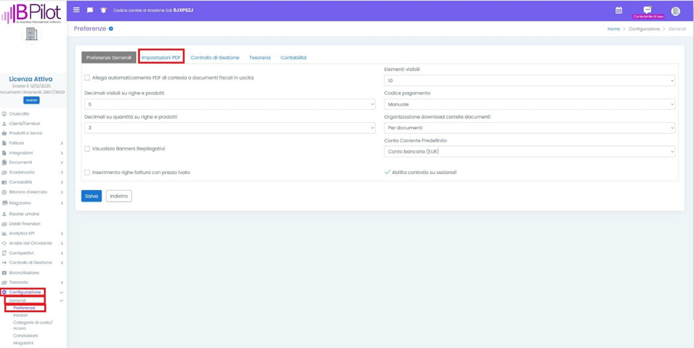Per accedere alla sezione Impostazioni PDF, apri il menù laterale sinistro e vai in Configurazione → Generali → Preferenze.