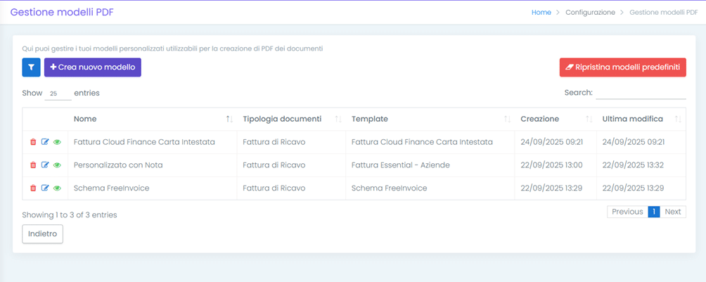 Cliccare su + Crea nuovo modello per creare un nuovo modello di pdf