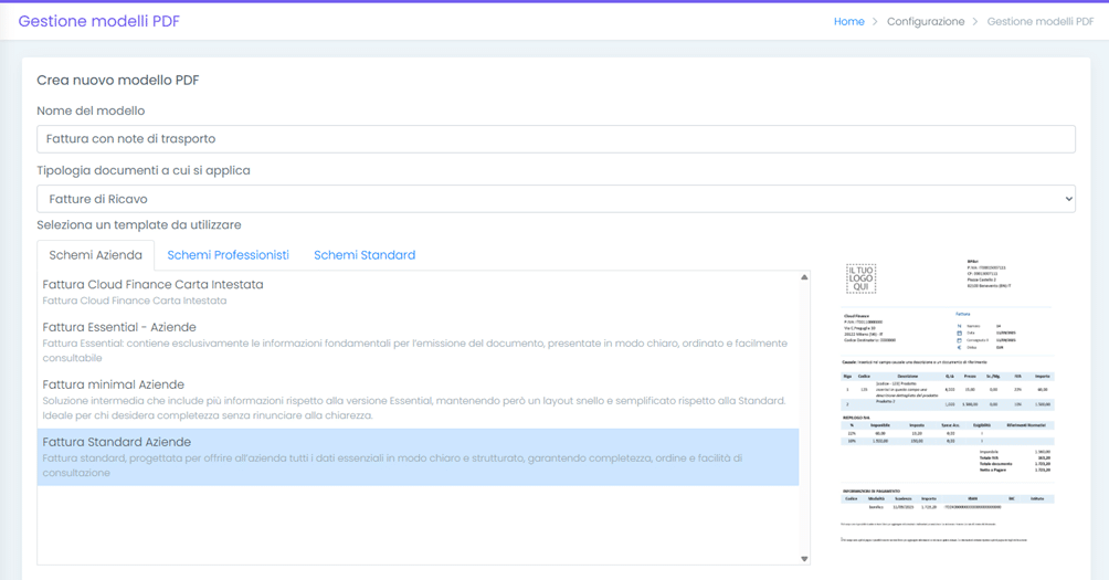 Puoi selezionare velocemente il template che preferisci per ogni tipologia di documento selzionandolo dalla relativa select. Cliccando sul tasto laterale di modifica andrai a personalizzare il template con un logo o delle note aggiuntive, a seconda di quello che richiede il template.