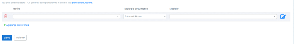 Cliccare su “Aggiungi preferenza”, quindi selezionare il profilo di fatturazione a cui applicare il template, la tipologia di documento e il modello. Cliccare sul tasto modifica per accedere al pannello di personalizzazione del modello.