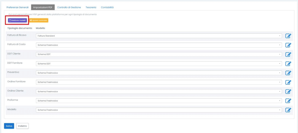 Per creare un modello personalizzato puoi cliccare su Gestione Modelli