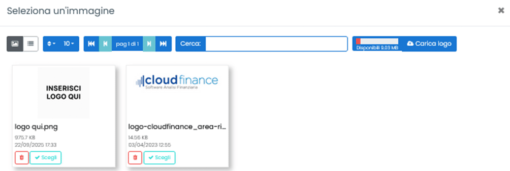 Selezionare un logo e cliccare su Carica Logo: