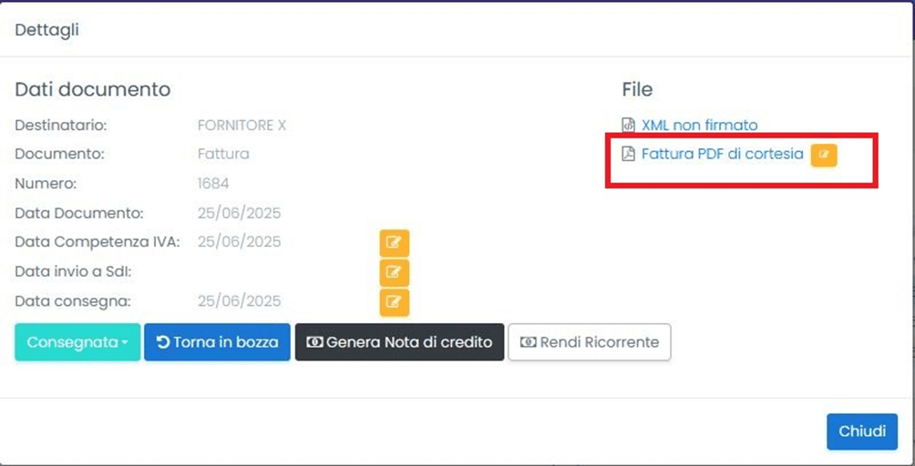Nella schermata dei dettagli, cliccare su “Modifica”, accanto a Fattura PDF di cortesia