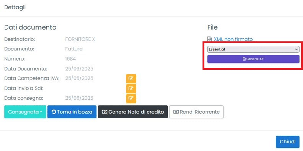 La piattaforma genera in automatico i pdf in base al modello selezionato nelle preferenze per la tipologia di documento o per il profilo di fatturazione. Puoi, però, sempre rigenerare un PDF selezionando un modello differente. Per rigenerare un PDF, cliccare sullo “Stato del Documento”