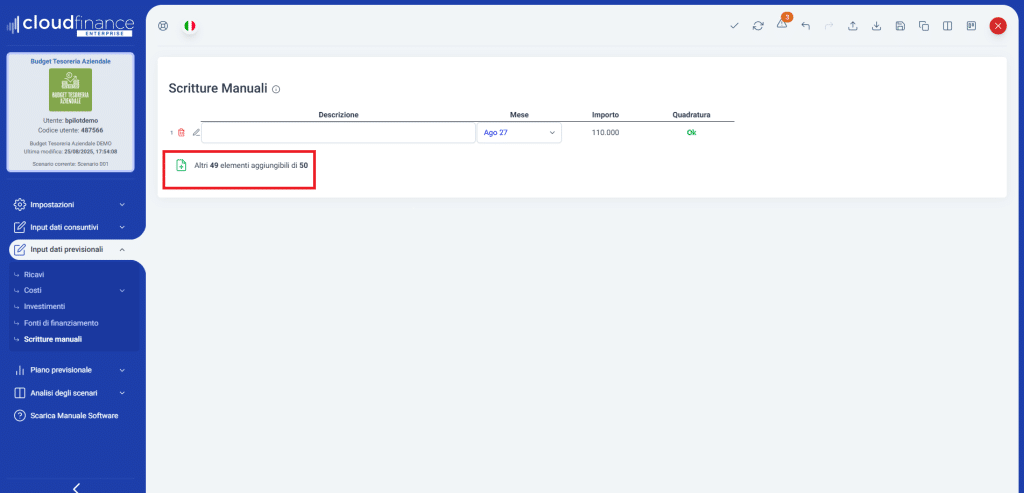 In questa sezione avanzata l’utente potrà inserire delle scritture di partita doppia qualora nelle sezioni precedenti non sia riuscito a generare in automatico tutte le diverse ipotesi previsionali.