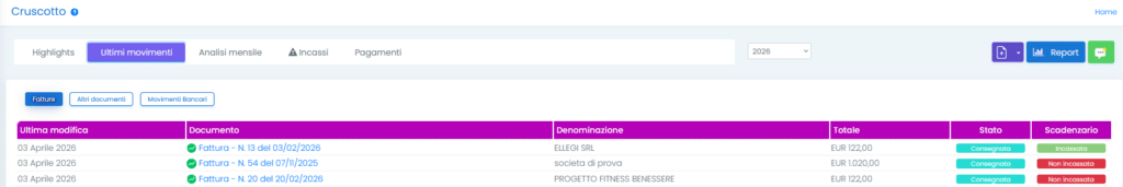 Nella sezione relativa agli ultimi movimenti sono elencati in ordine cronologico tutti i documenti fiscali o non fiscali, movimentati. Per movimentati si intende una qualunque modifica al documento, ivi compresa la ricezione di una notifica dallo SDI che ne cambia lo stato. Tra i movimenti non saranno presenti i documenti cestinati o cancellati definitivamente.