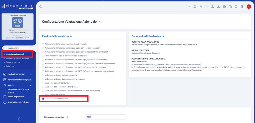Per calcolare il congruo canone aziendale bisogna selezionare la finalità “Valutazione canone di affitto” nella sezione “Impostazioni generali”