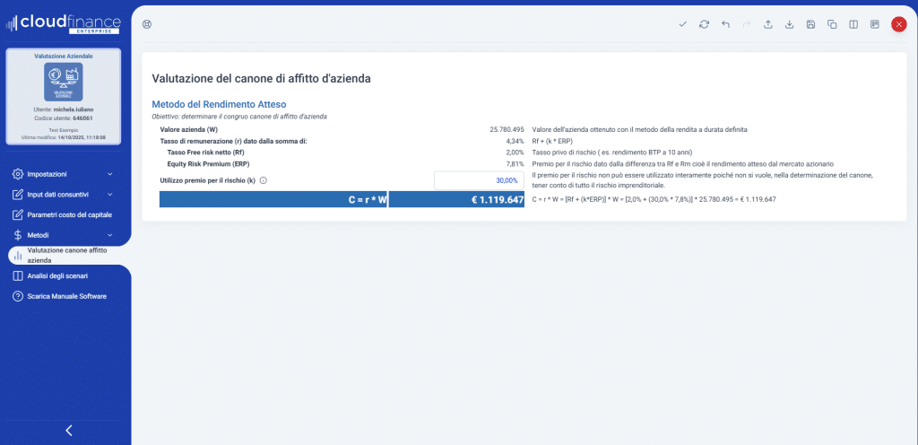 Dopo aver considerato i dati relativi al Tasso Free Risk netto e all’Equity Risk Premium, il sistema applica la formula che moltiplica il tasso di remunerazione per il valore dell’azienda.